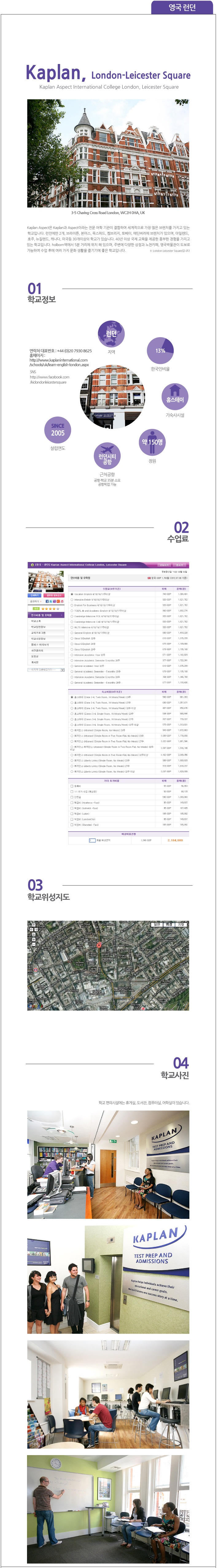 Kaplan Aspect은 Kaplan과 Aspect이라는 전문 어학 기관이 결합하여 세계적으로 가장 많은 브렌치를 가지고 있는 학교입니다. 런던에만 2개, 브라이튼, 본머스, 옥스퍼드, 켐브리지, 토베이, 에딘버러에 브렌치가 있으며, 아일랜드, 호주, 뉴질랜드, 캐나다, 미국등 30개이상의 학교가 있습니다. 40년 이상 국제 교육을 제공한 풍부한 경험을 가지고 있는 학교입니다. holborn역에서 5분 거리에 위치 해 있으며, 주변에 다양한 상점과 노천카페, 영국박물관이 도보로 가능하여 수업 후에 여러 가지 문화 생활을 즐기기에 좋은 학교입니다.